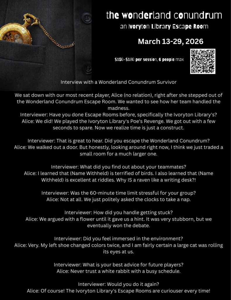 Book Now! Apply Here Afternoon Cribbage at the Ivoryton LibraryMonday Afternoons 1-3pm in the Community RoomClick here for more information Click here for a brochure listing our digital resources for downloading ebooks, audiobooks, movies and more Resources Youth Services Book Clubs The Ivoryton Library publishes a monthly eNewsletter called Librarying, bringing you selected new book releases, upcoming adult and children’s programming, book club updates and other fun snippets.Submit your email there>>>> to sign upClick here to read the latest issue Sign Up for our eNewsletter, Librarying!Email (required) *Select list(s) to subscribe toGeneral InterestConstant Contact Use. Please leave this field blank.
